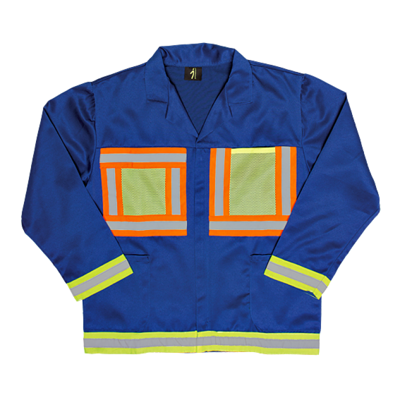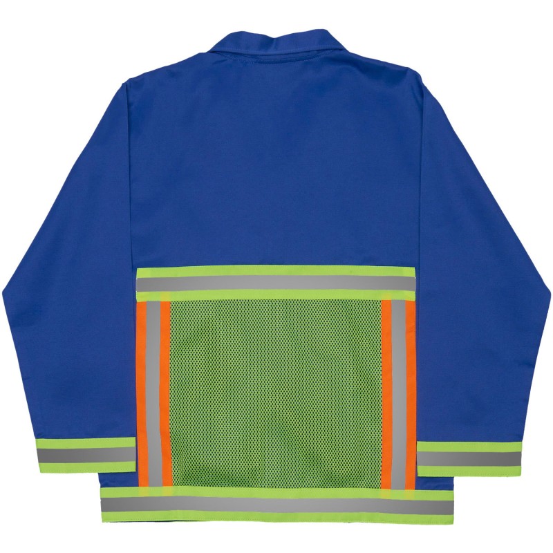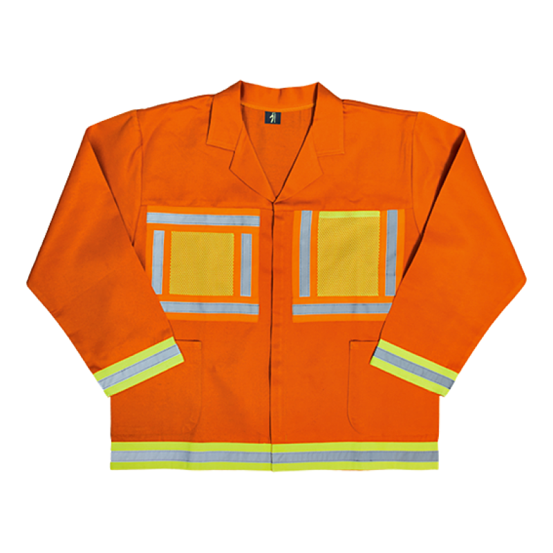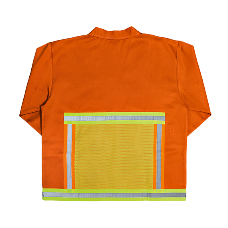 - 50mm orange and silver reflective tape (EN 20471 Class II) bordering hi-vis mesh pockets on front and mesh square on back