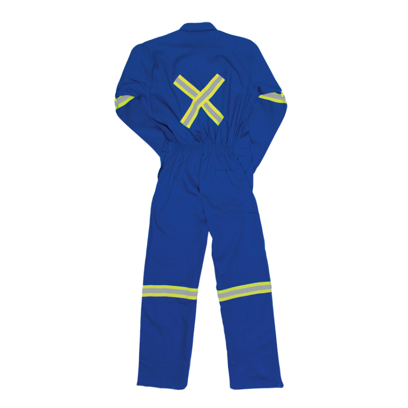 and silver reflective tape (EN 20471 Class II) around arms, legs, X on